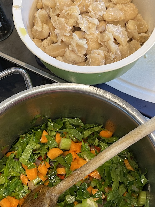Bohnen sind bereits fertig (s.o.). Möhren in Viertelscheiben (siehe Foto) schneiden, Zwiebel in Würfel, Knoblauch in Stücke und das Staudensellerie-Grün grob hacken. Die Chilischote in feine Streifen schneiden. Achtung, danach nicht mit den Fingern ins Gesicht!